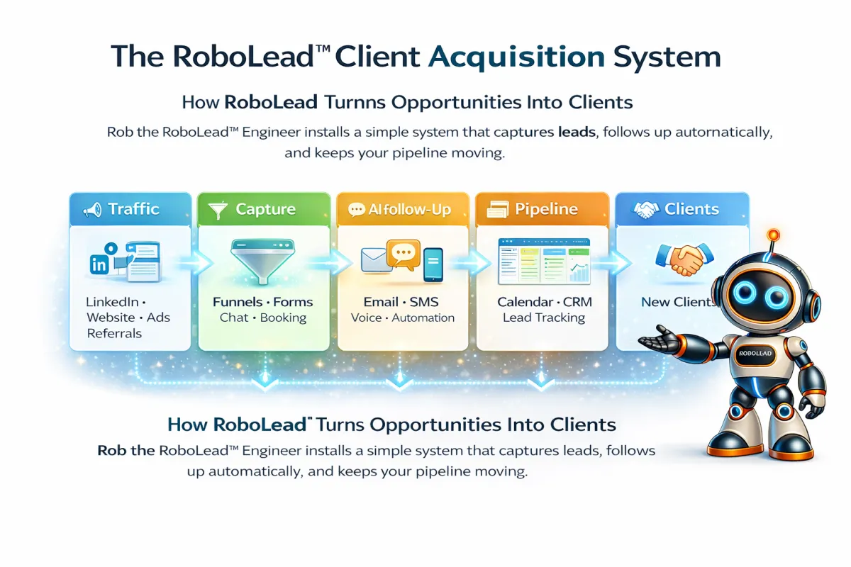 While you focus on serving your clients, Rob the RoboLead™ Engineer keeps your client acquisition system running smoothly.